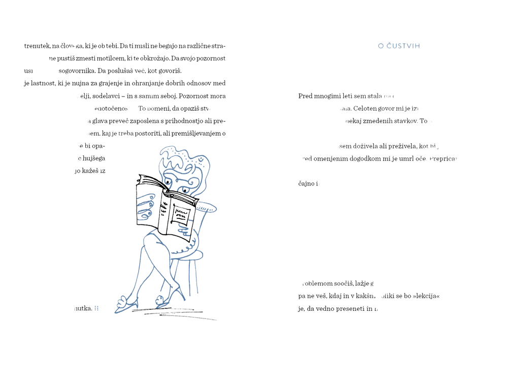 Navdušila si me; tako z načinom pisanja, tistim, kar veje iz tvojih besed, domiselnostjo, globoko preprostostjo (zelo kompleksno perfekcionistične osebe od prej – oprosti, ker si dovolim tako izraziti svoje mnenje, z vsem spoštovanjem!), pikicami med tekstom in dovršenostjo knjige kot celote. Kar pa seveda še zdaleč ni vse.